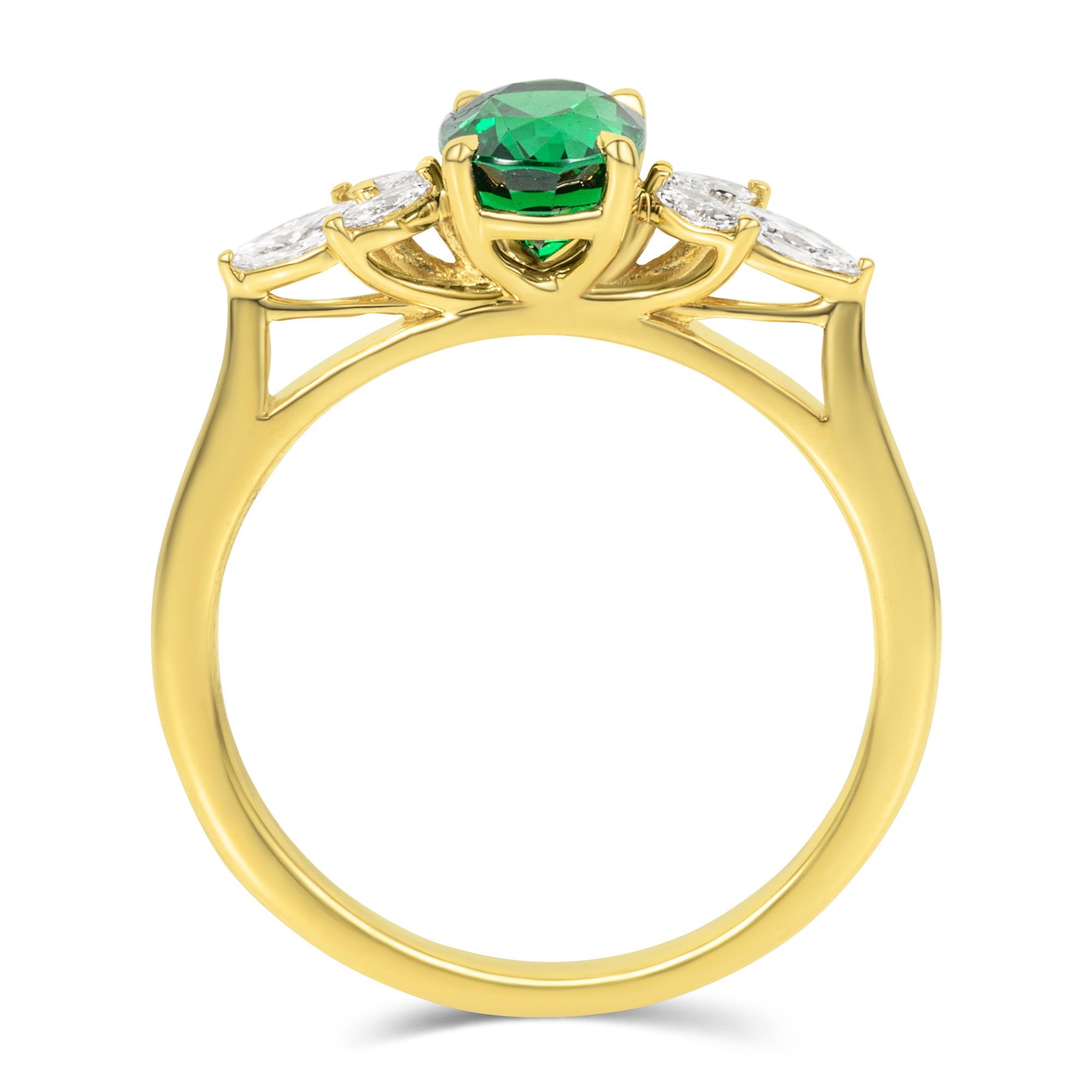 This stunning tsavorite garnet and diamond ring, crafted in 18ct yellow gold, features a stunning vivid green tsavorite garnet accented by three marquise cut diamonds set in a leaf motif on either side.