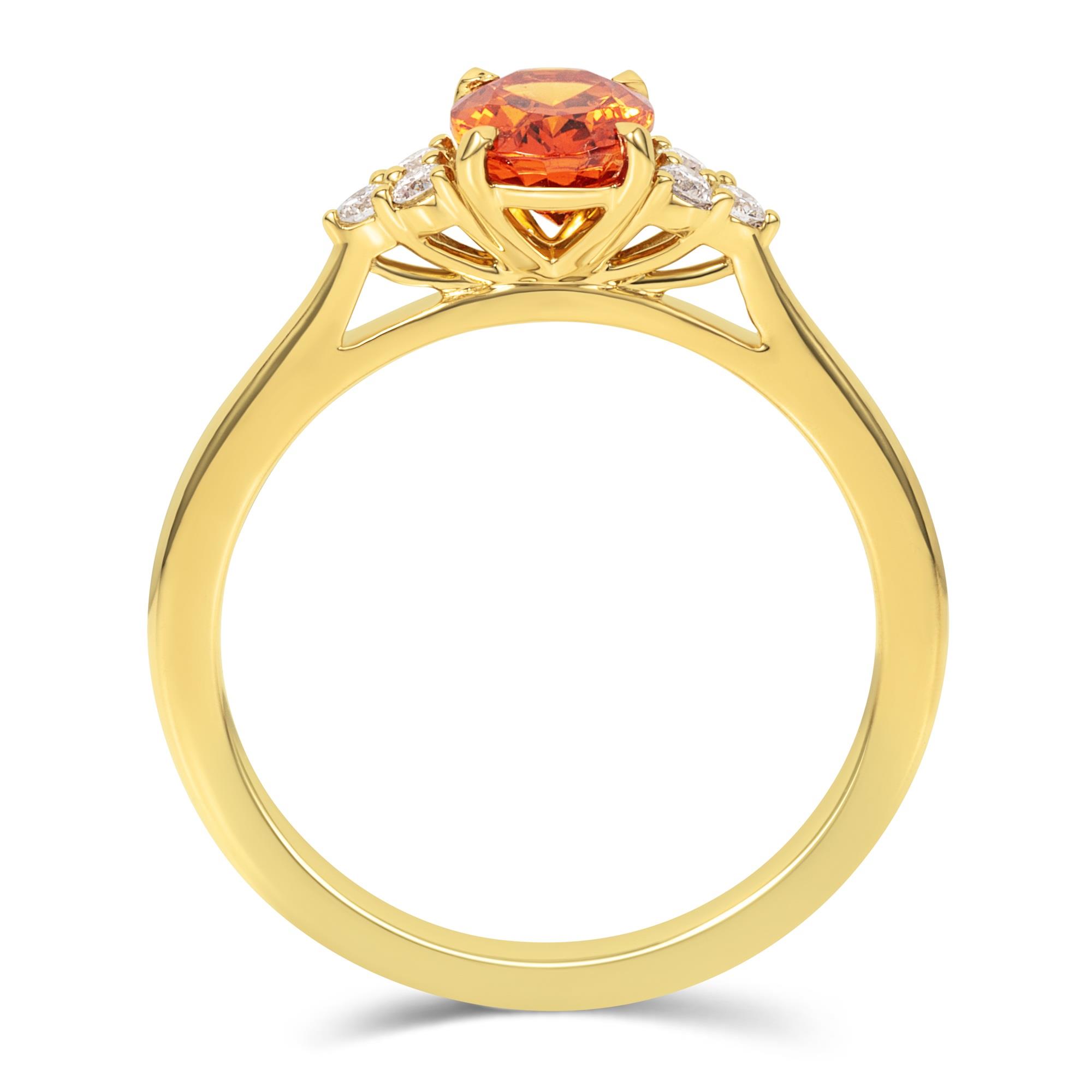 This exquisite mandarin garnet and diamond engagement ring is finely crafted in 18ct yellow gold. This timeless design features a vibrant mandarin garnet accented by three round brilliant-cut diamonds either side. The sleek plain yellow gold band allows the bright colour of the emerald to become the focal point of the ring.
