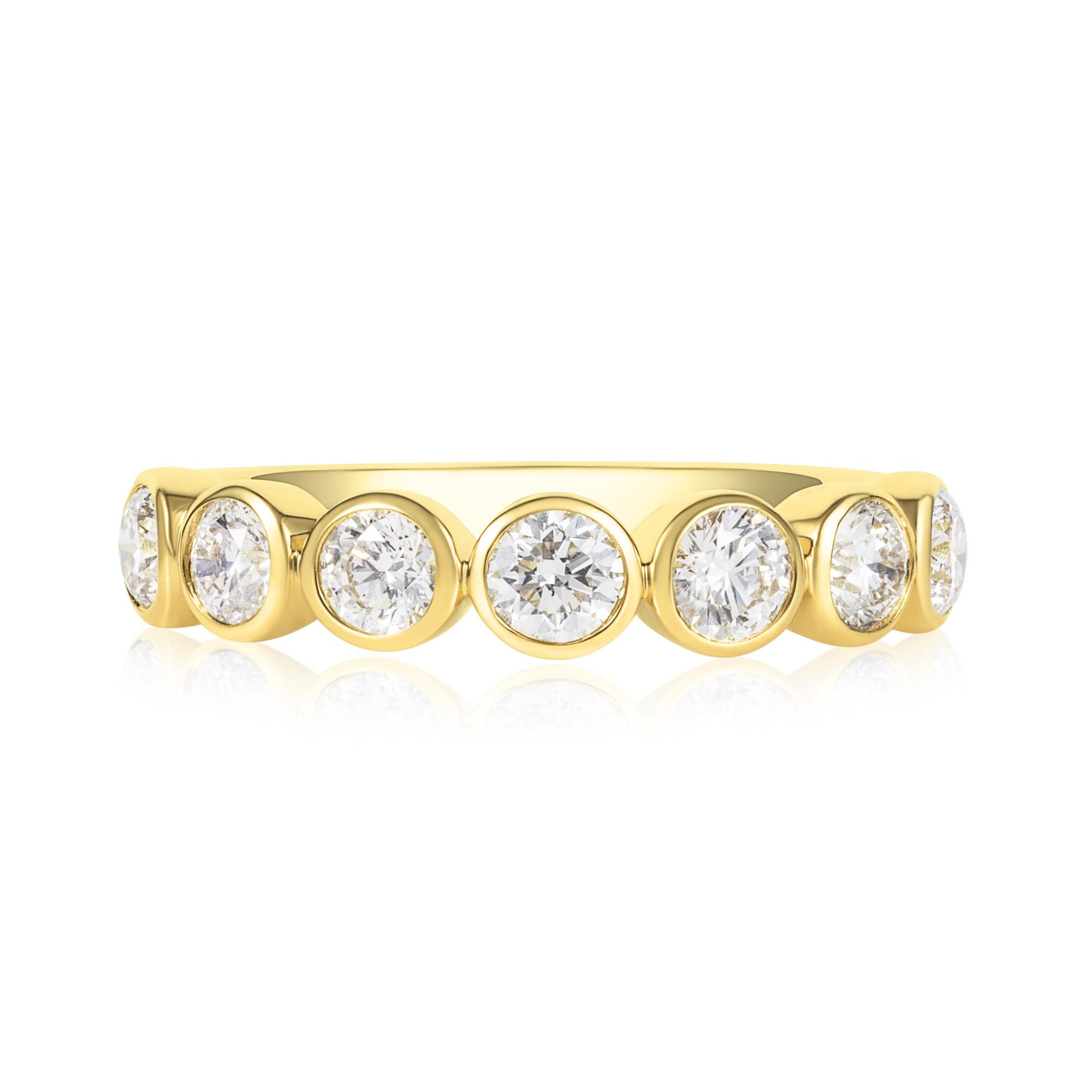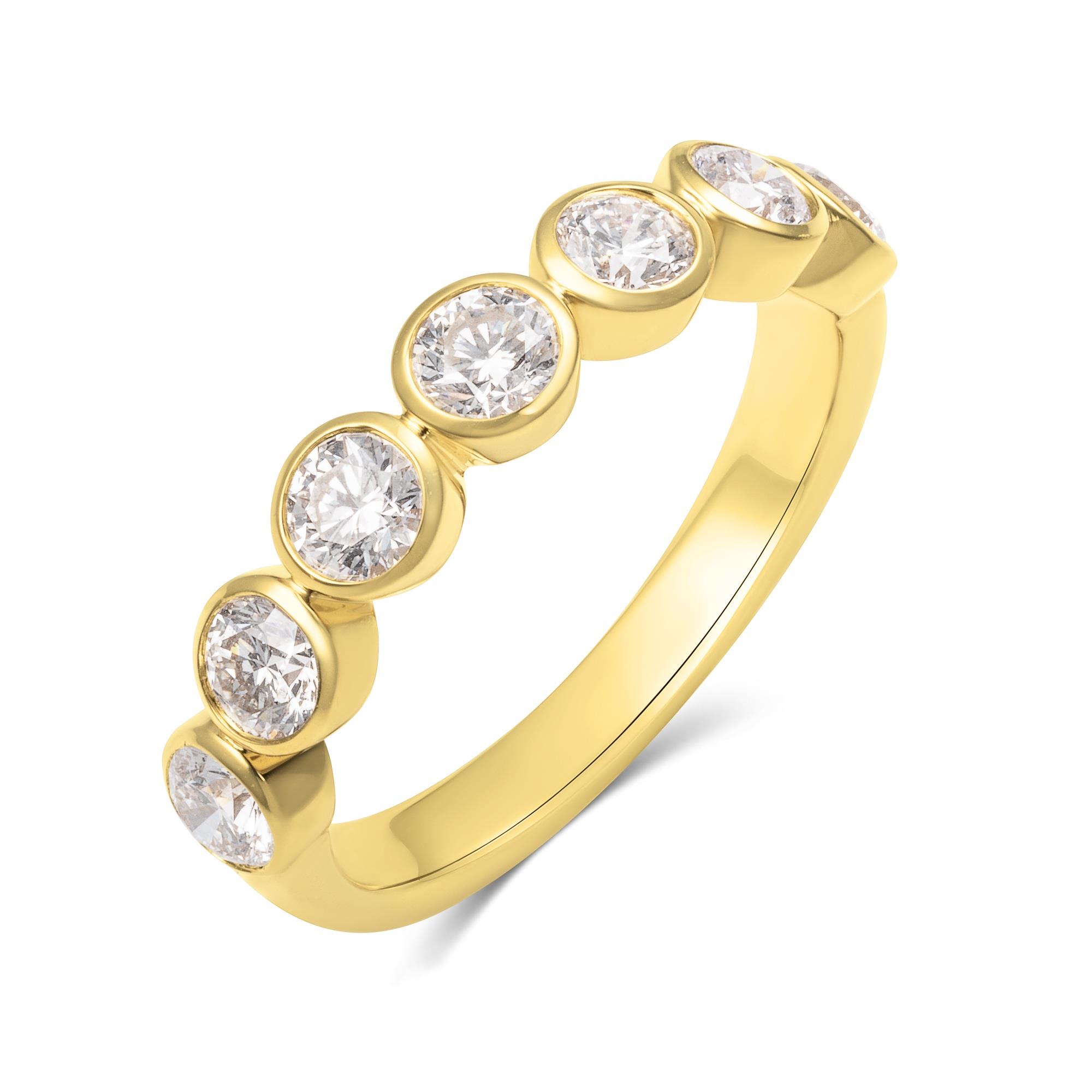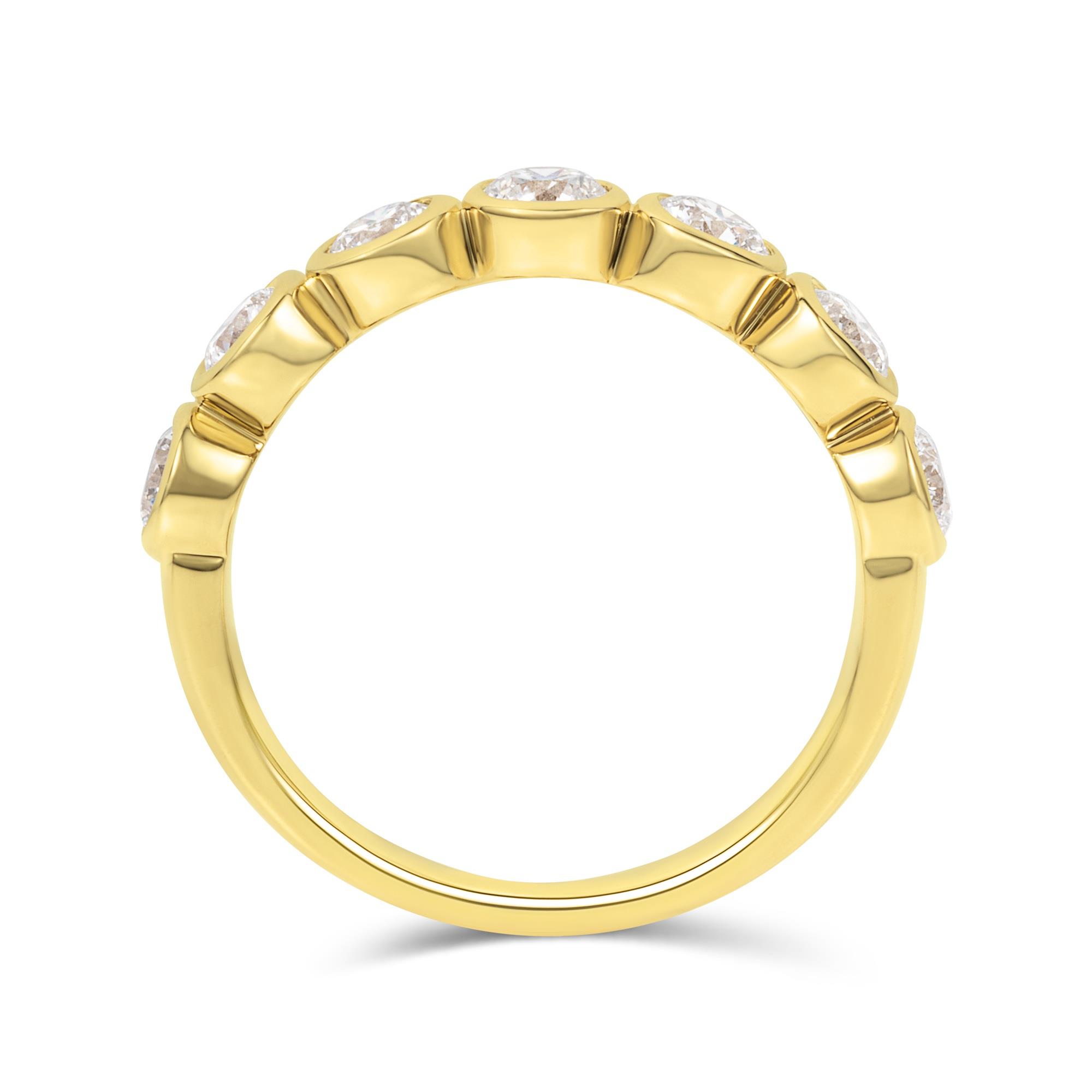 Modern diamond seven stone ring crafted in 18ct yellow gold. This contemporary design features seven round brilliant-cut diamonds in bezel settings with a plain yellow gold band.