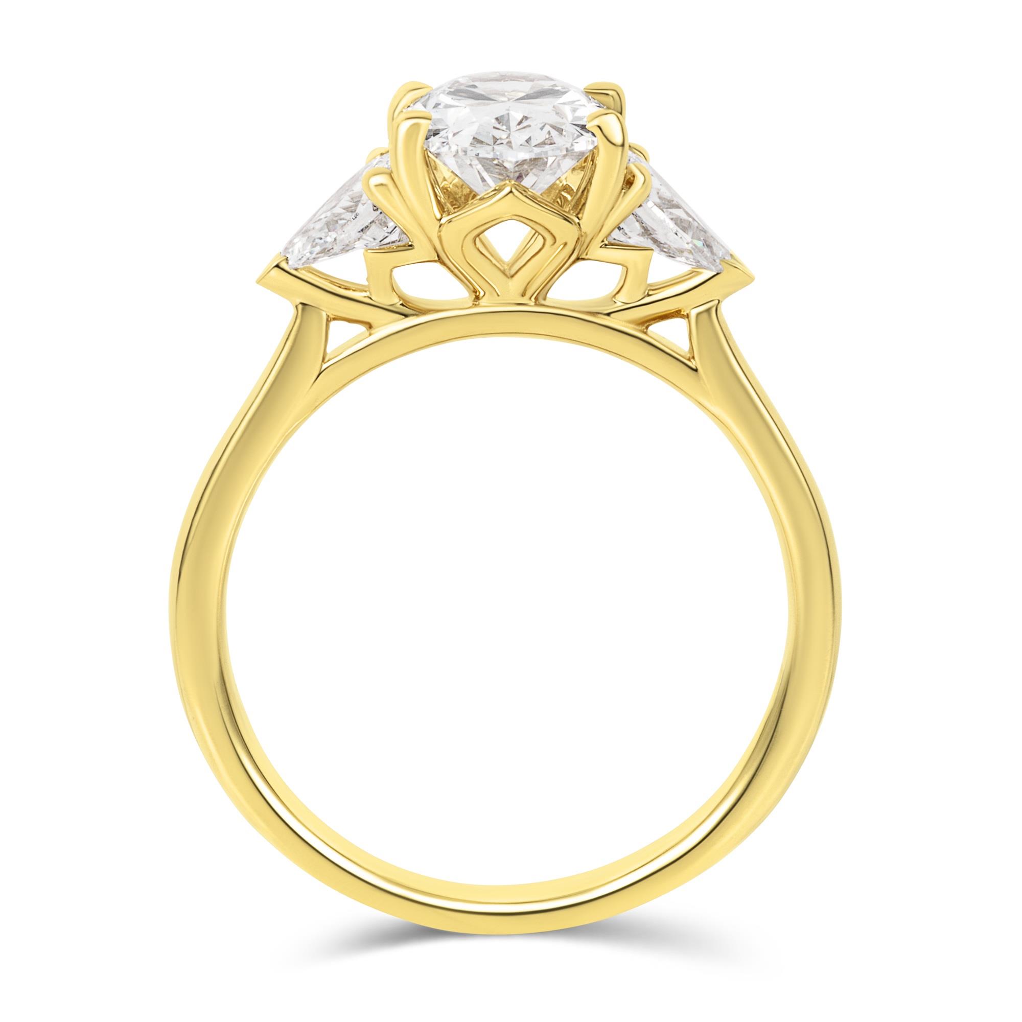 A three stone engagement ring crafted in 18ct yellow gold, featuring a pear shape laboratory grown diamond in a claw setting with pear cut laboratory grown diamond sides.