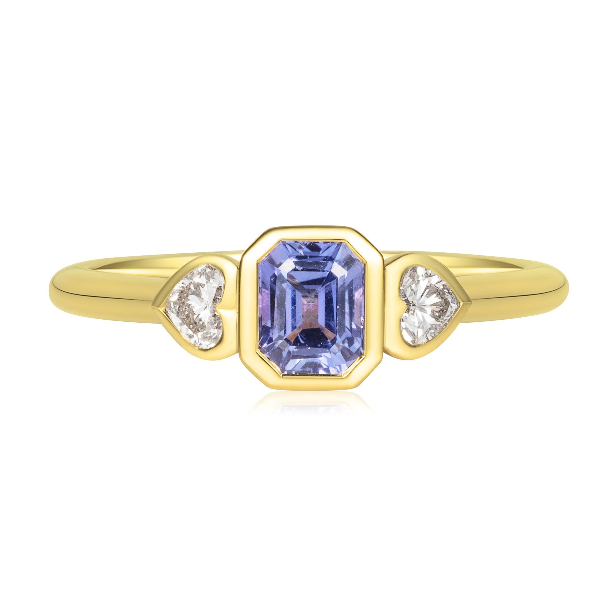 Modern violet sapphire and diamond three stone engagement ring crafted in 18ct yellow gold. This unique design features a beautiful emerald-cut violet sapphire centre stone flanked by a sparkling heart shape diamond on either side, all in fine bezel settings. The perfect colourful twist on the classic three stone engagement ring design.