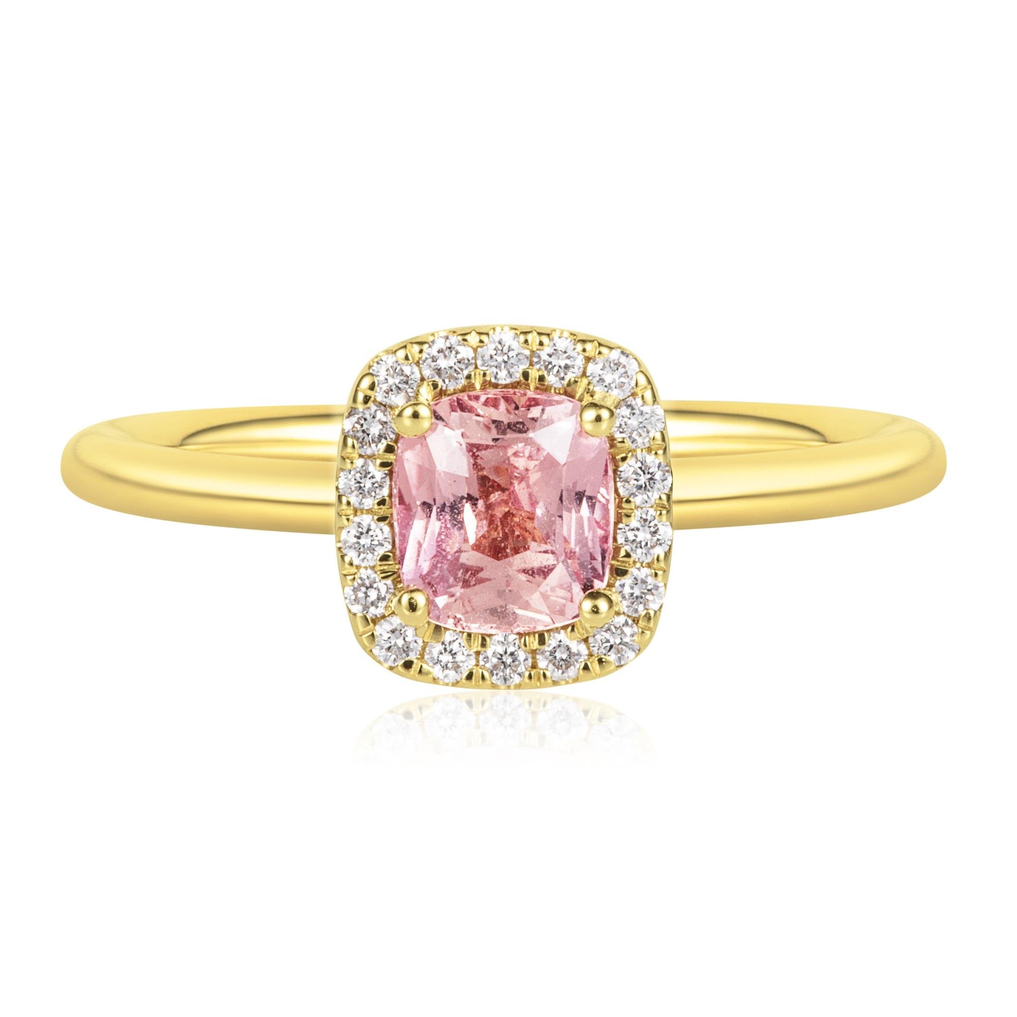 18ct Yellow Gold Cushion Padparadscha Sapphire and Diamond Halo Ring