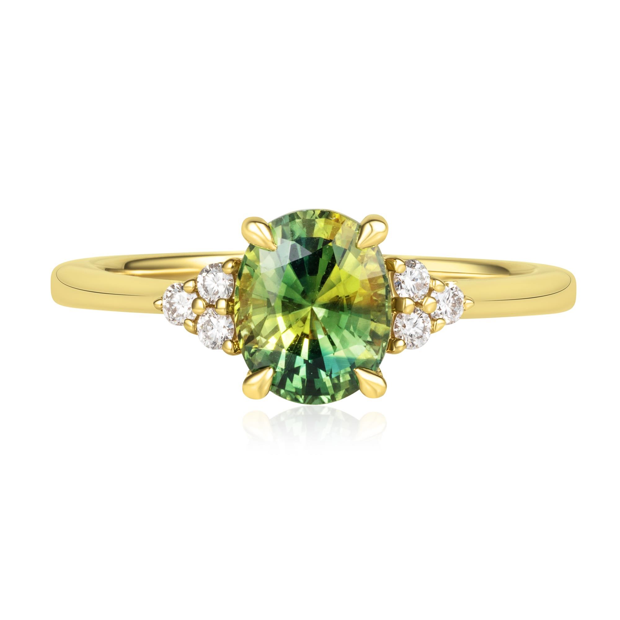 Fall in love with this striking bi-colour sapphire and diamond engagement ring. Crafted in warm 18ct yellow gold, the ring features a unique oval sapphire centre which has flashes of teal and yellow and a three diamond cluster on either side. Explore more colour gemstone engagement rings at Pravins.