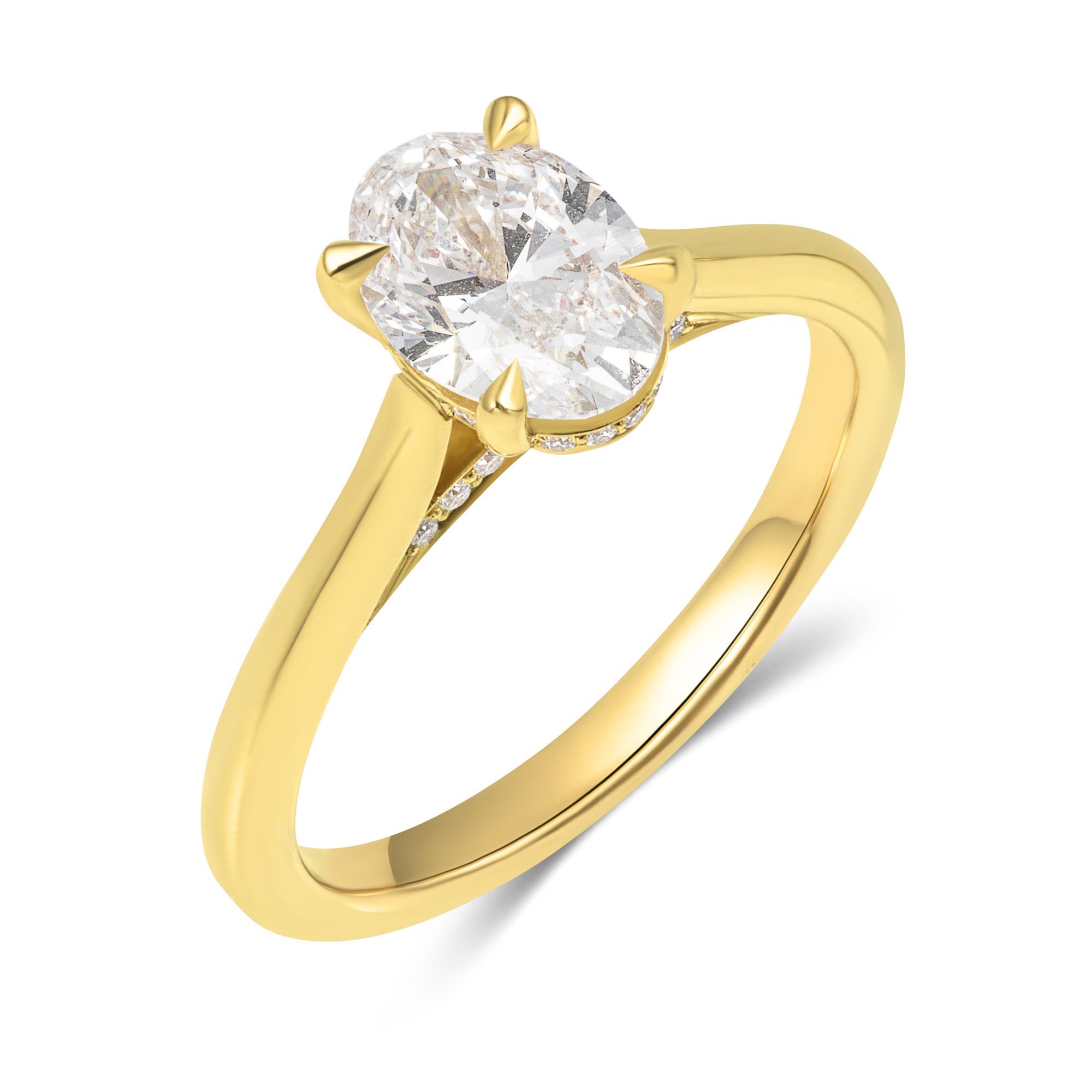 A contemporary solitaire engagement ring featuring an oval-cut diamond and hidden diamond halo and bridge, crafted in 18ct yellow gold.