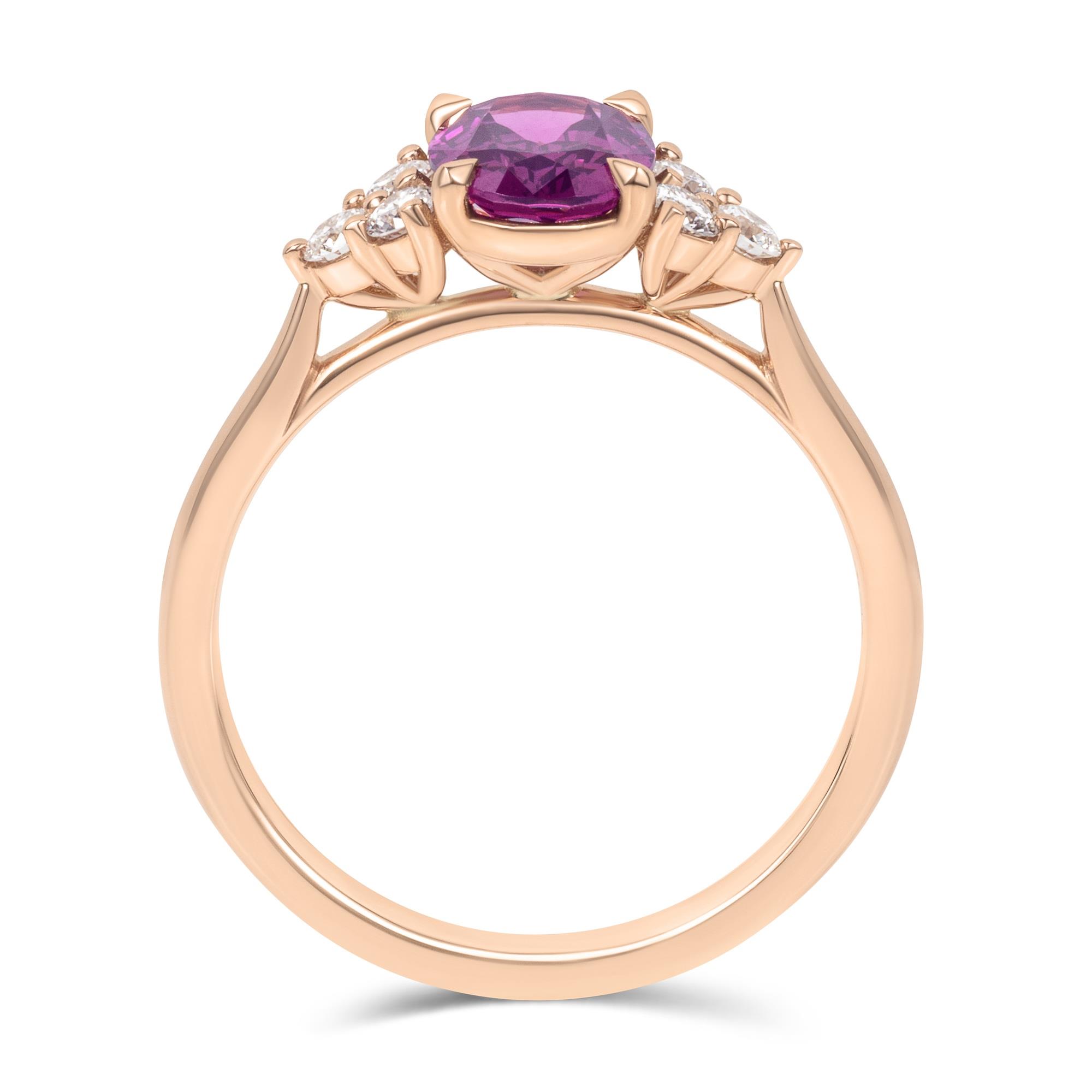 This stunning purple garnet and diamond engagement ring is expertly crafted in 18ct rose gold. This timeless design features an unusual oval-cut purple garnet accented by three round brilliant-cut diamonds either side. The sleek plain rose gold band allows the vivid colour of the garnet to become the focal point of the ring.