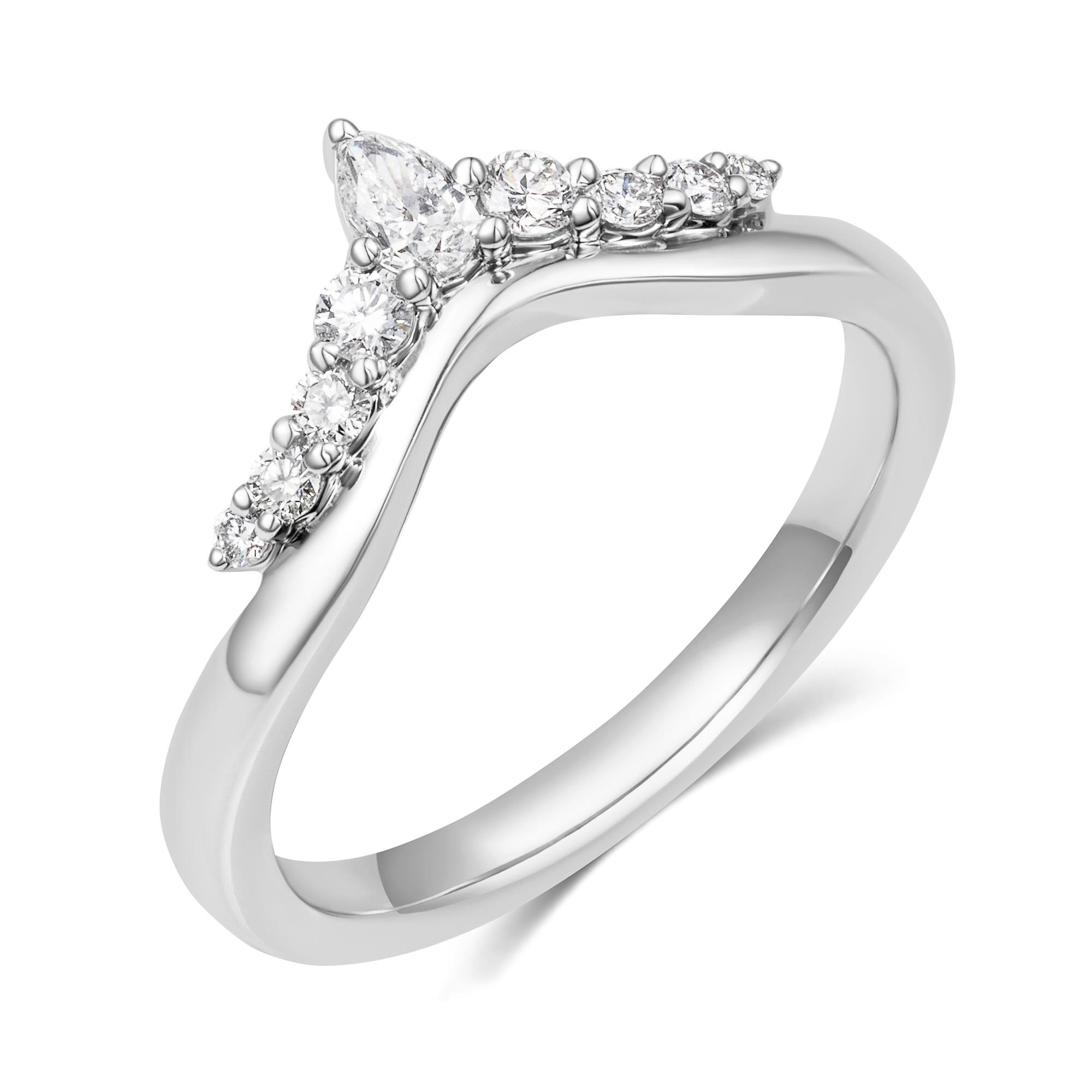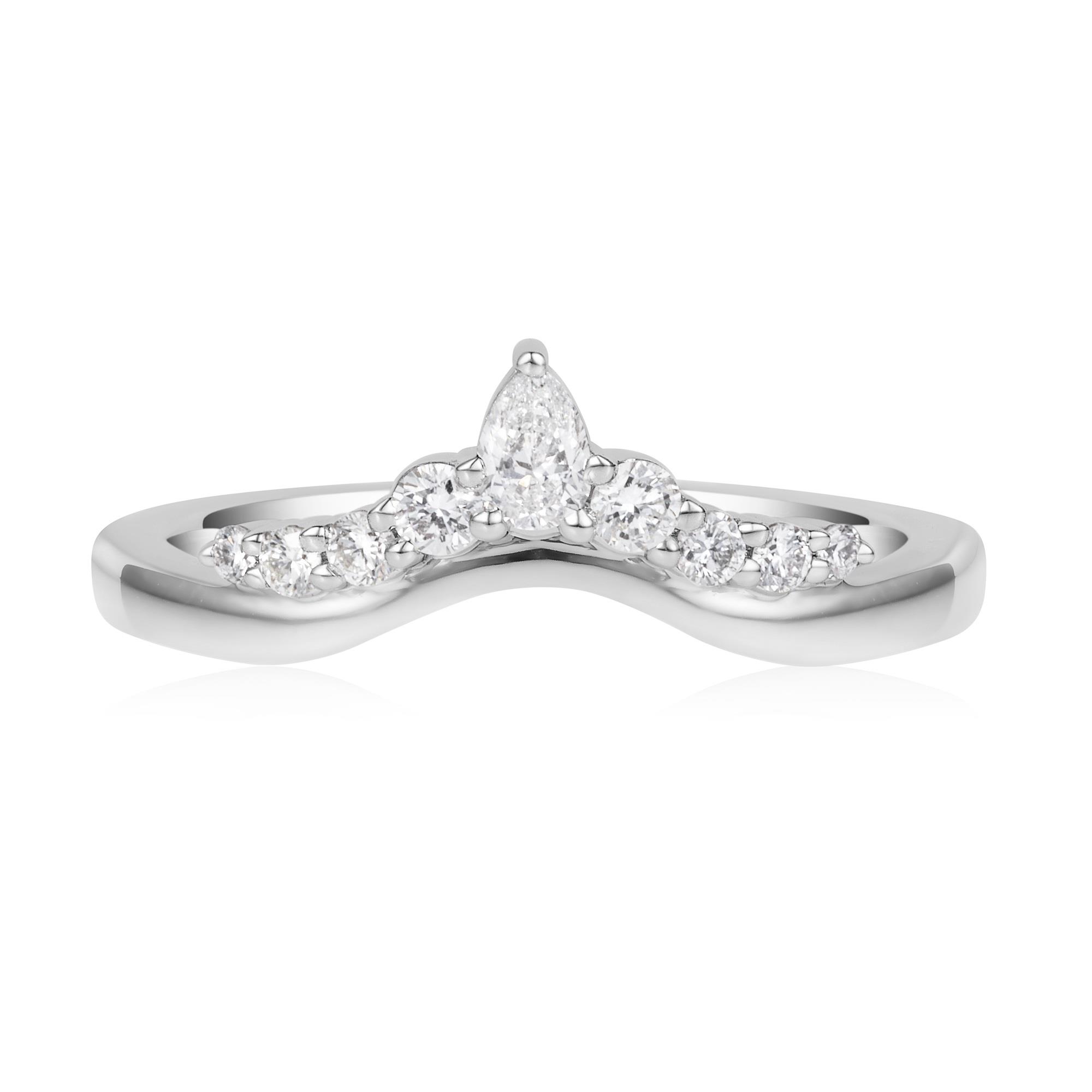 Elegant diamond shaped curved band crafted in platinum. This delicate design features eight graduated round diamonds and a central pear diamond set in a crown shape on the outer edge of the curved edge of band. .