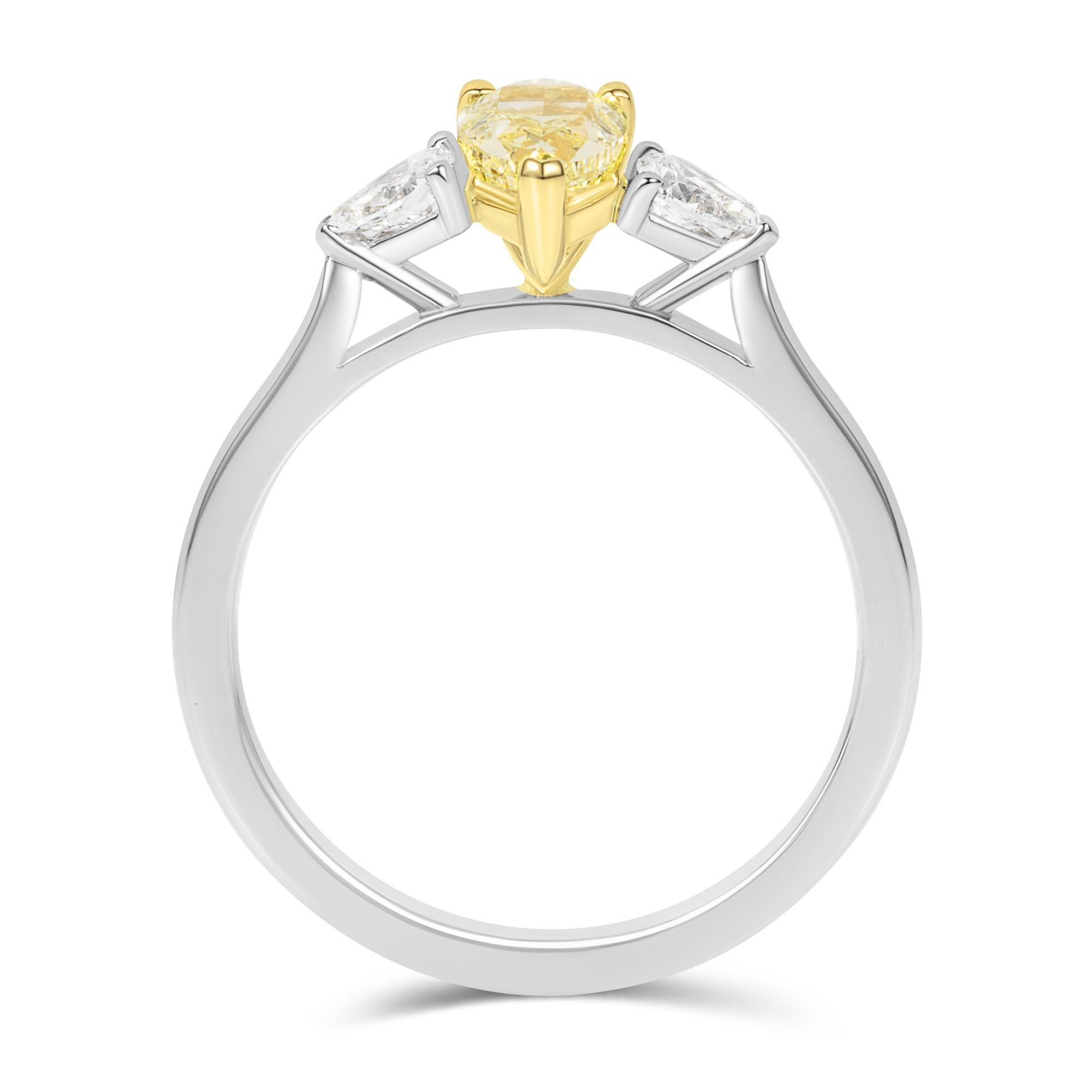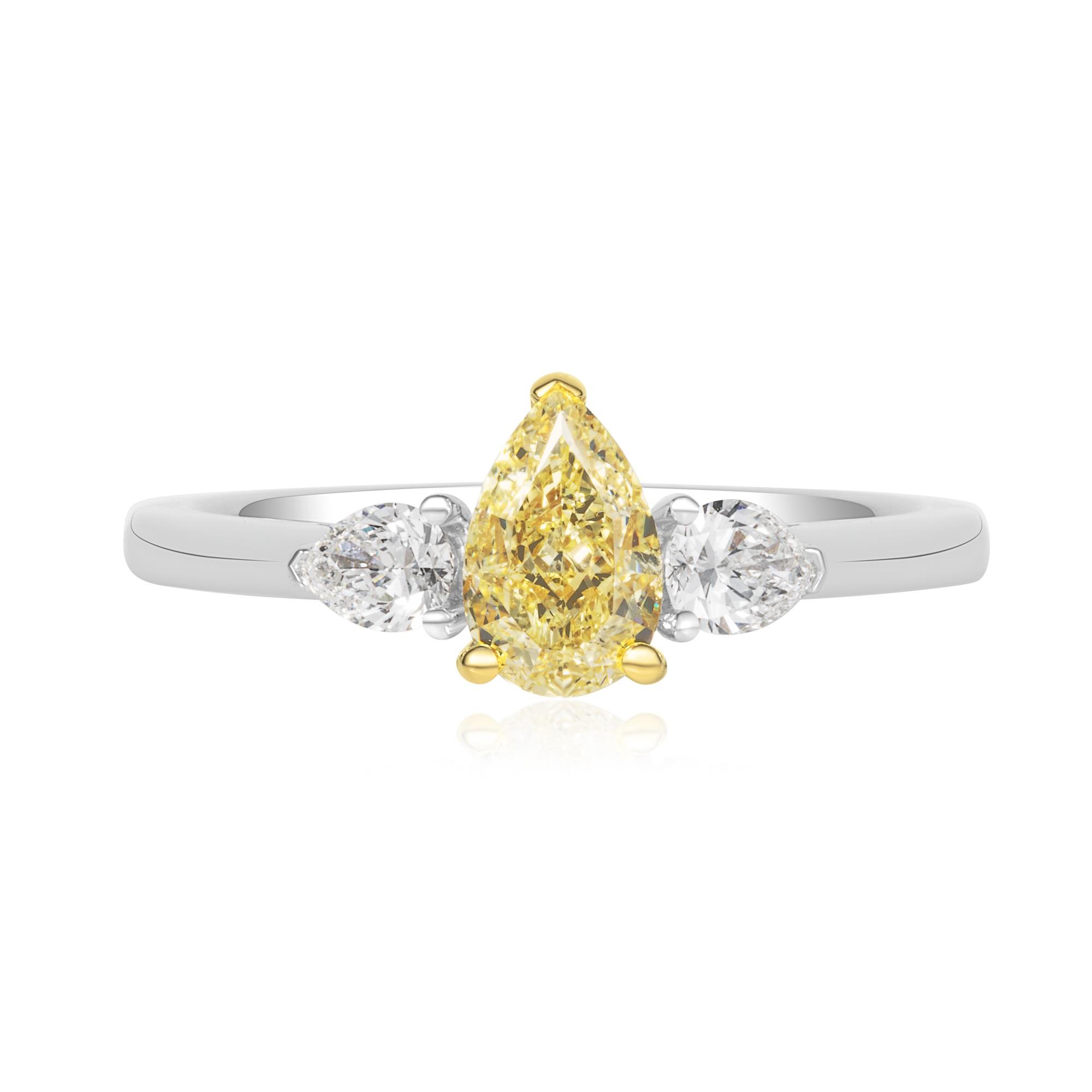 An exquisite three stone engagement ring crafted in platinum and 18ct yellow gold. This elegant design features a fancy yellow pear shape diamond centre stone flanked by a white pear shape diamond on either side.