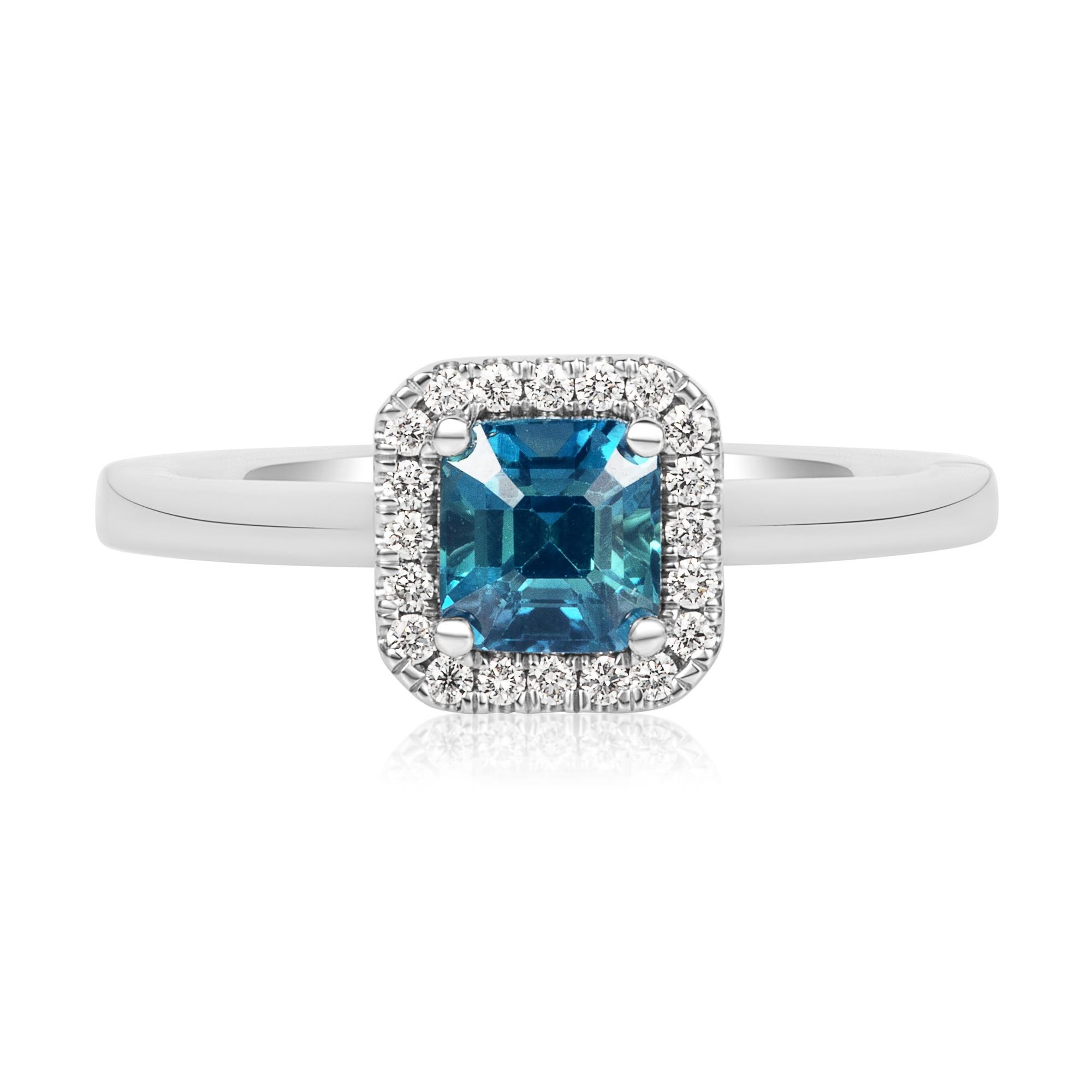 An elegant engagement ring featuring a mesmerising asscher cut teal sapphire surrounded by a halo of round brilliant-cut diamonds. With its unique hue of blue-green colour, teal sapphire is an increasingly popular alternative to blue sapphire. The diamond halo beautifully enhances the rich colour of the asscher-cut teal sapphire in the centre. Explore coloured gemstone engagement rings at Pravins.