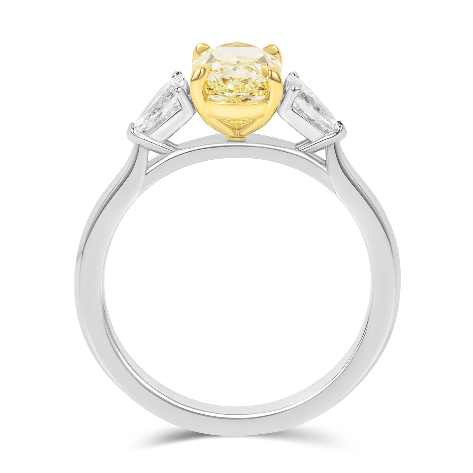 A charming three stone engagement ring crafted in platinum and 18ct yellow gold. This elegant design features a fancy light yellow oval-cut diamond centre stone flanked by a white pear shape diamond on either side.