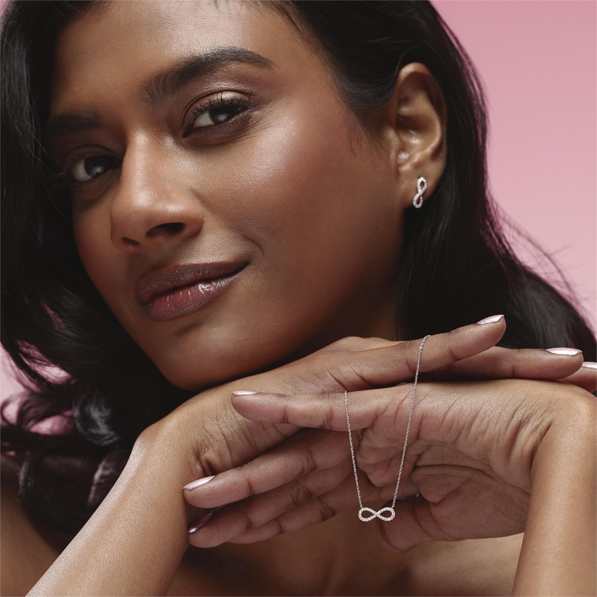 From the Pravins Infinity collection, these earrings are a playful twist on a classic design. Crafted in 18ct white gold, the looped figure eight is set with round brilliant diamonds for maximum sparkle. These earrings come complete with a stem and butterfly fitting.