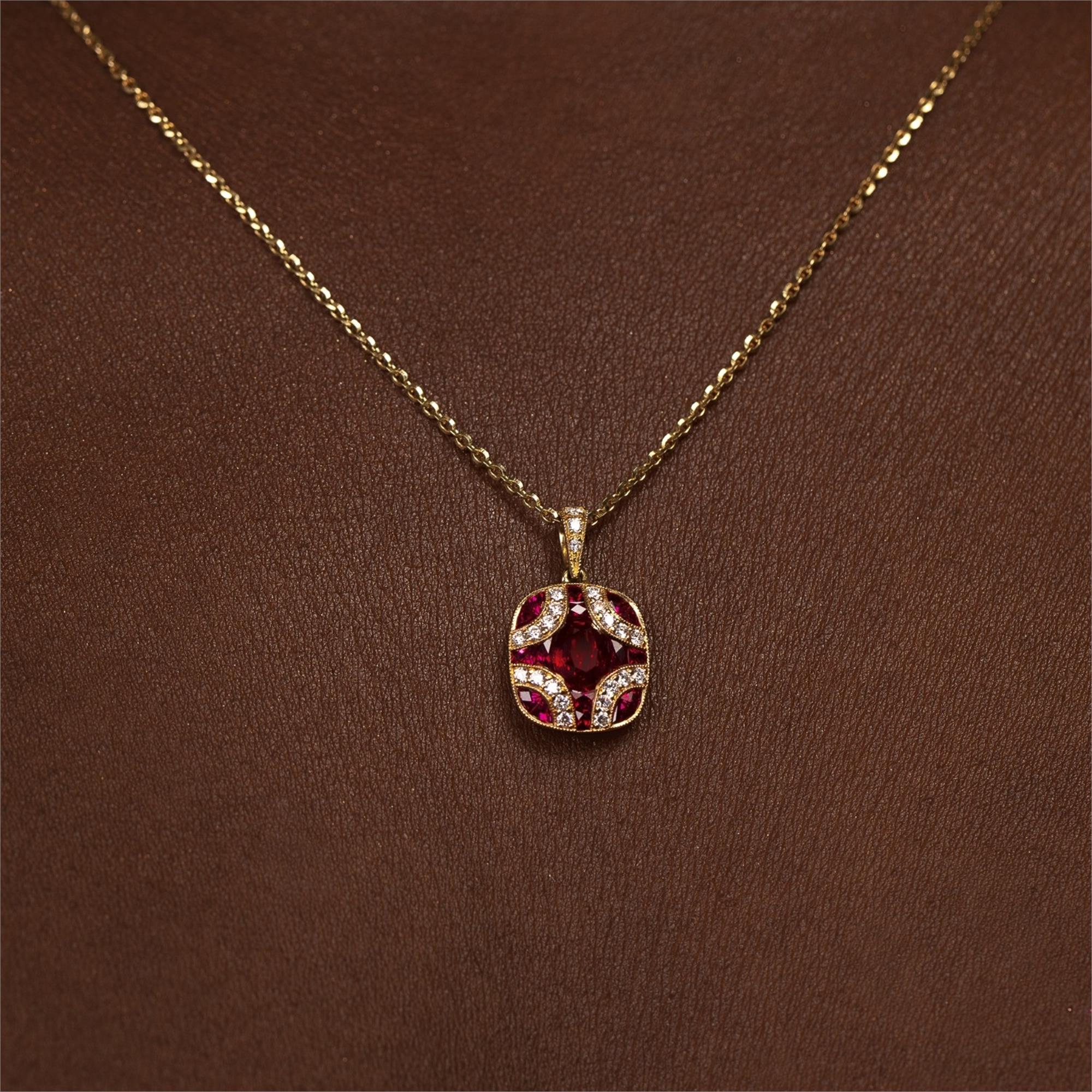 Vintage inspired cushion shape ruby and diamond pendant crafted in 18ct yellow gold. This striking design features illusion set rubies and pave-set diamonds accented by a pave-set bail. The milgrain detailing on the edges add the perfect finishing touch to this timeless design.