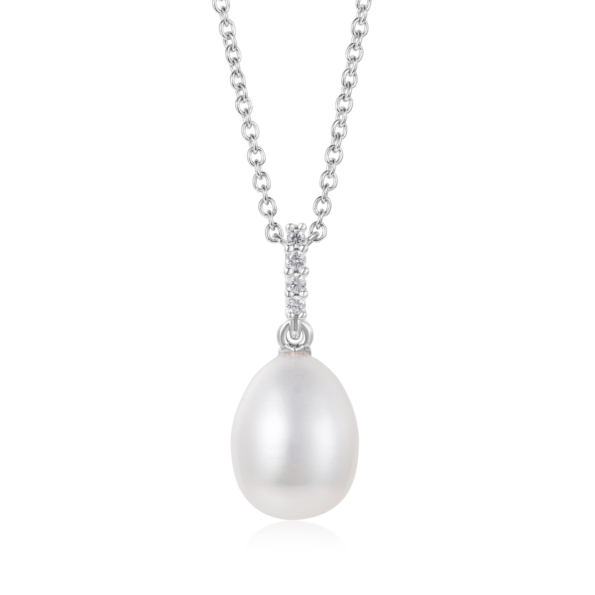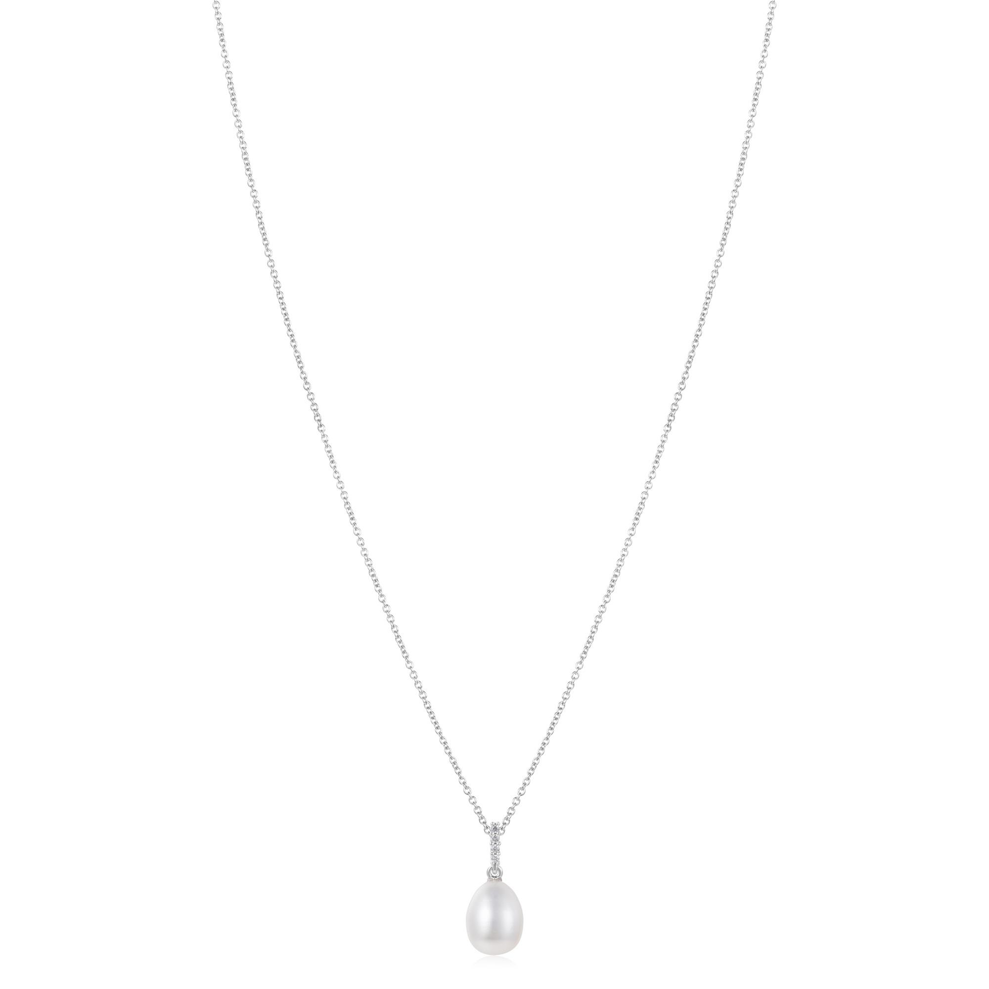 Delicate pearl and diamond drop pendant crafted in 18ct white gold. This timeless design features a white oval shaped freshwater pearl suspended from a straight diamond set bail.