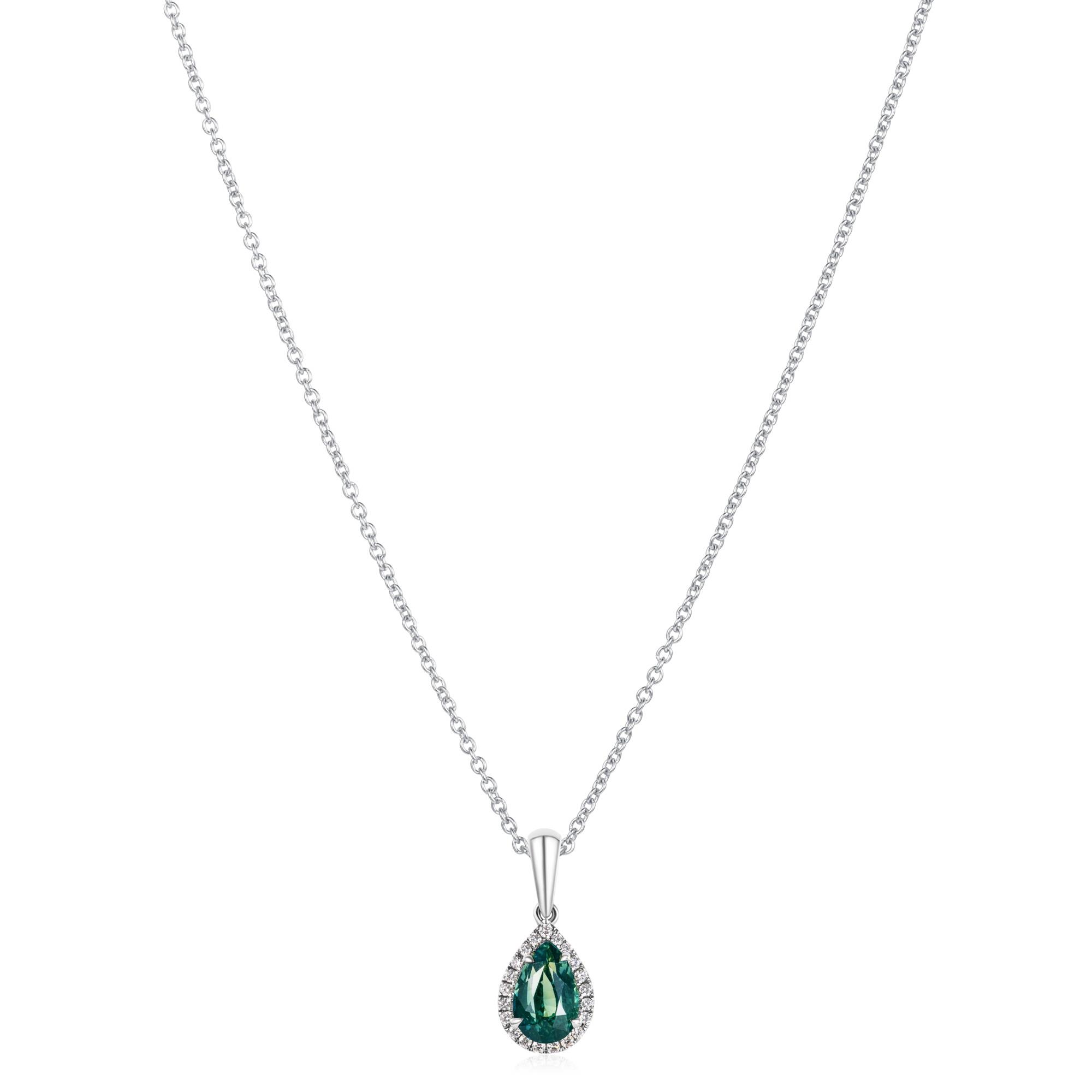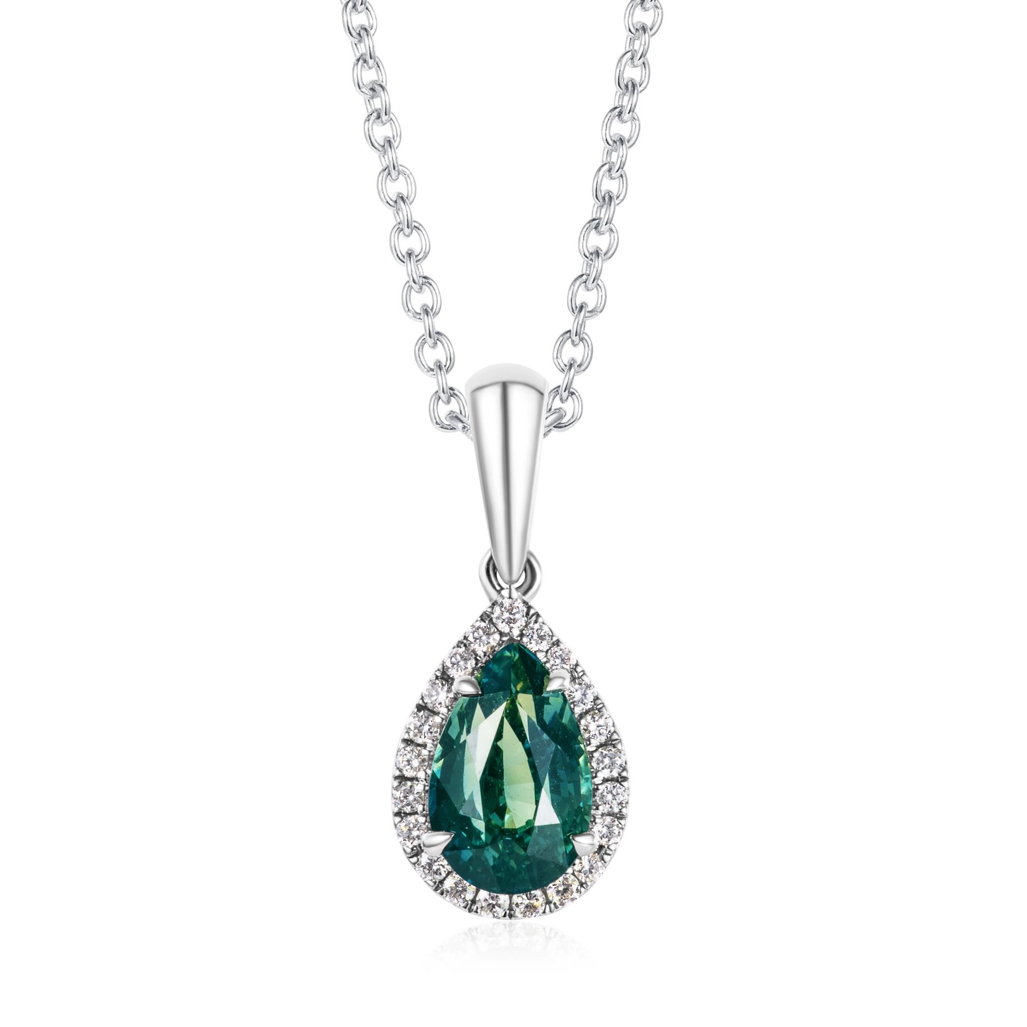 Camellia 18ct White Gold Pear Teal Sapphire and Diamond Pendant