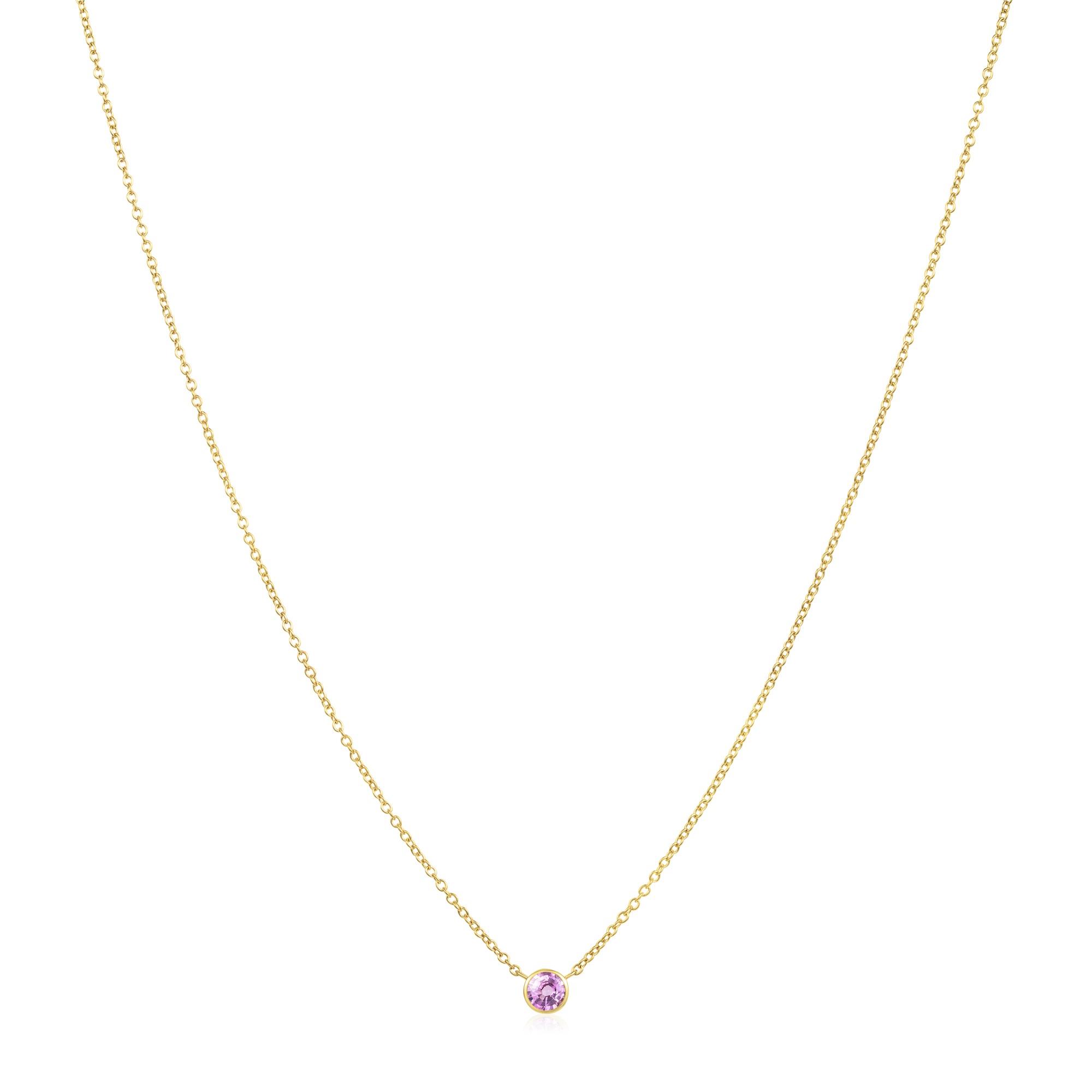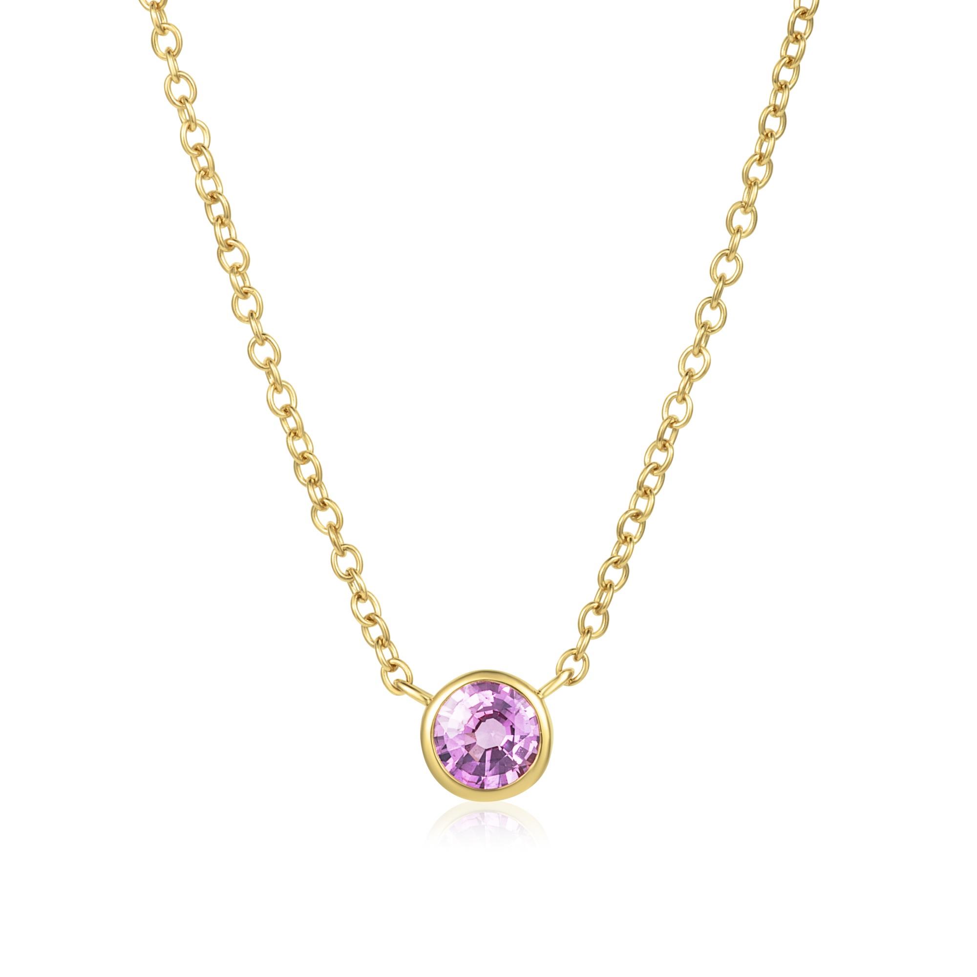 Crafted in 18ct yellow gold, this timeless solitaire necklace features a vivid pink round sapphire in a fine bezel setting, finished with a classic trace chain and lobster clasp.
