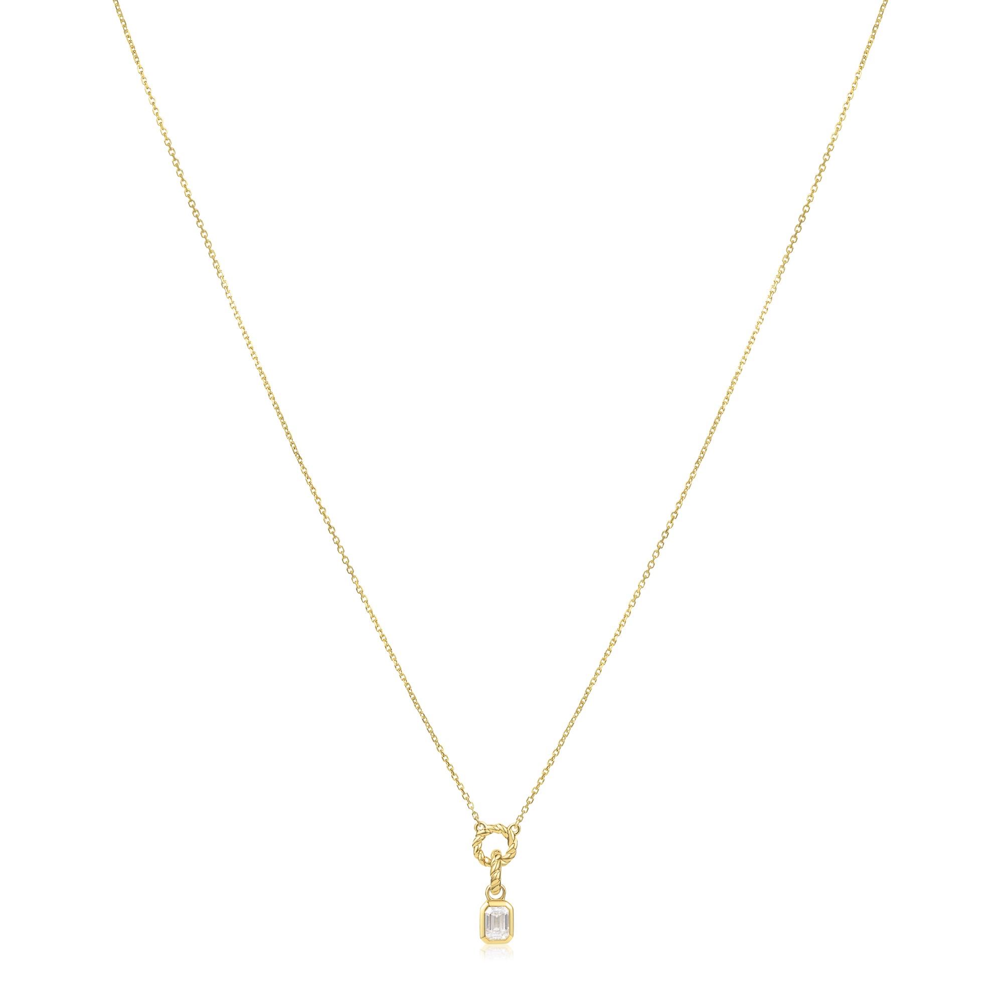 Beautiful drop necklace with a subtle but on trend rope design. The clean bezel setting highlights the beauty of the emerald-cut diamond which hangs perfectly from an 18ct yellow gold circle with a rope design finish and attached to a simple trace chain.