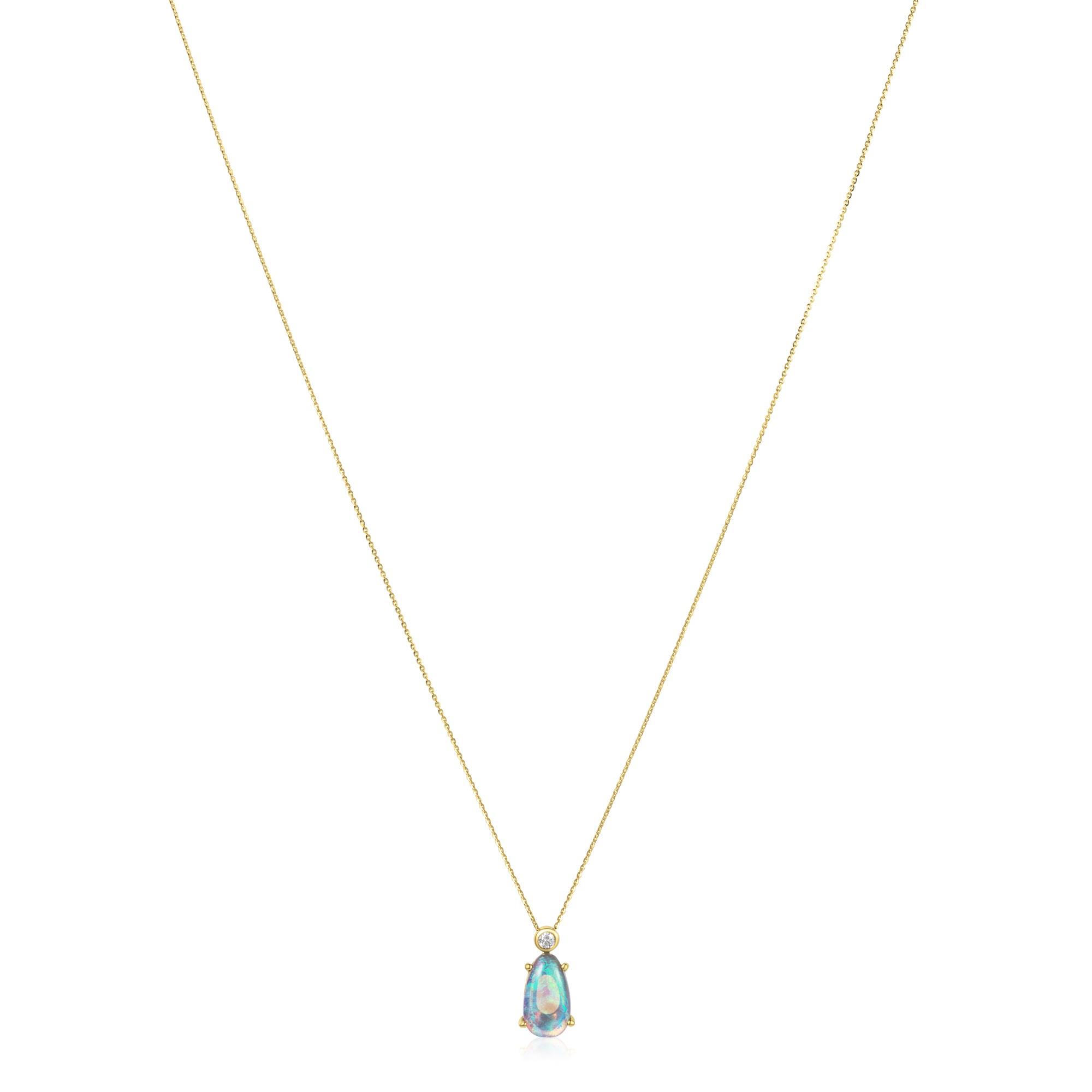 This elegant necklace is crafted in 18ct yellow gold and features a beautiful free form black opal as the centrepiece. With it's rich hues of blue, purple and green, the black opal is perfectly complemented by a single diamond set on the bail. The necklace is finished with a fine trace chain.