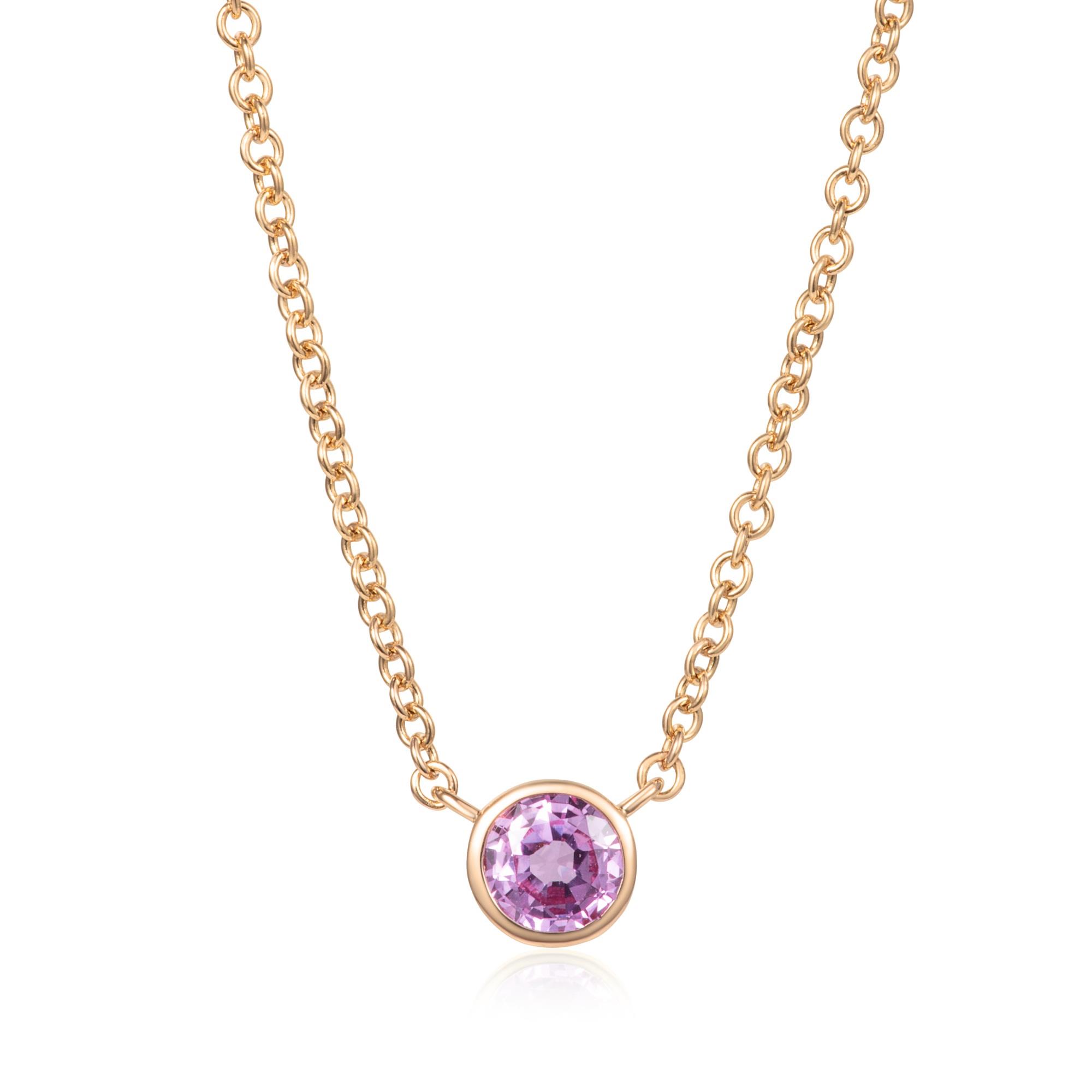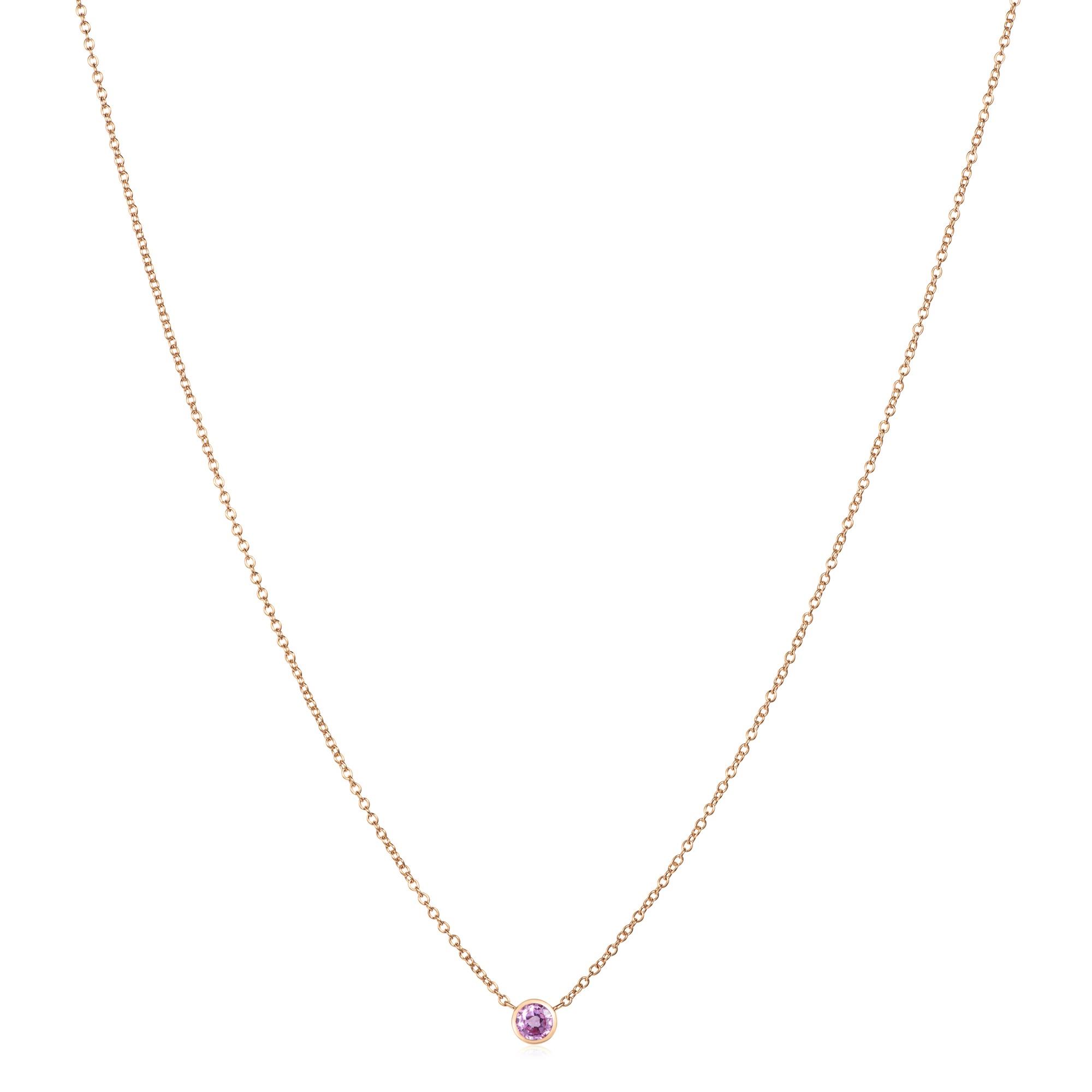 Crafted in 18ct rose gold, this timeless solitaire necklace features a vivid pink round sapphire in a fine bezel setting, finished with a classic trace chain and lobster clasp.