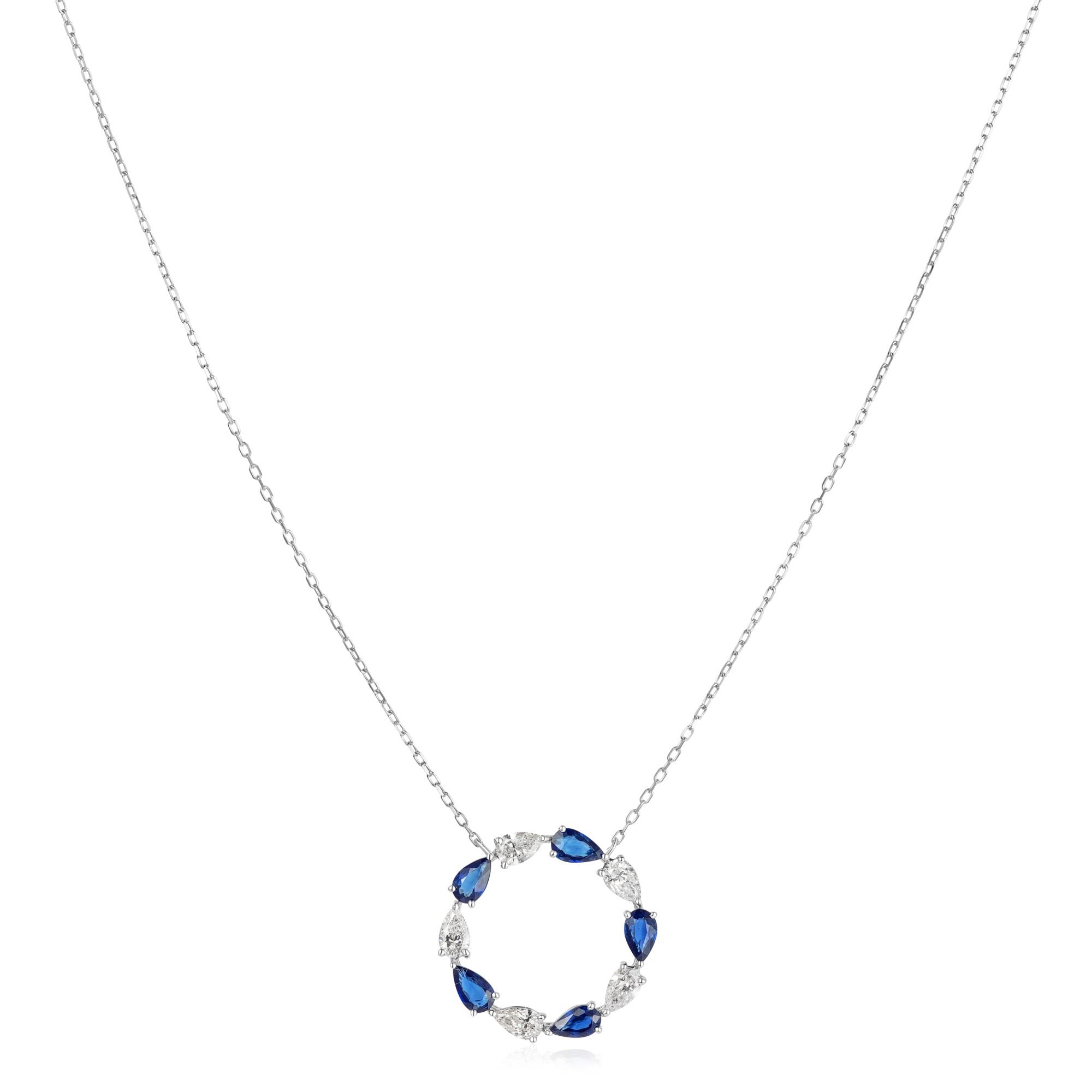 From the Pravins Aurora collection, this sapphire and diamond necklace is inspired by the graceful circle shapes found in nature. Finely crafted in 18ct white gold, this elegant design features a circle of alternating pear shape sapphires and diamonds all in claw settings The necklace has a lobster clasp and extra loops on a yellow gold trace chain.