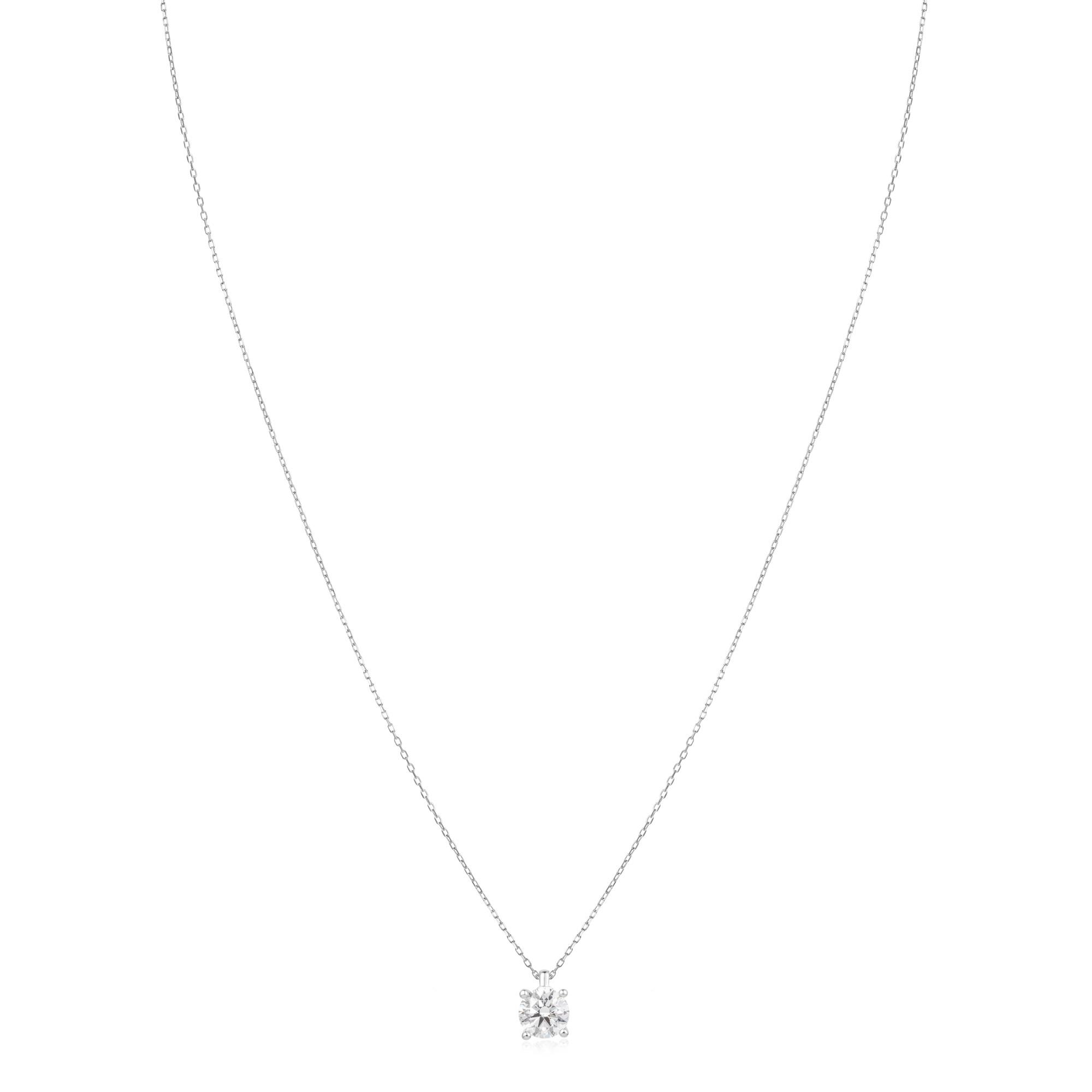 Classic laboratory grown diamond solitaire necklace crafted in 18ct white gold. This timeless design features a round brilliant-cut laboratory grown diamond in a four claw setting with a subtle tulip design and threaded onto a fine trace chain.